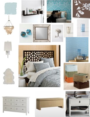 Credits: Paint by Benjamin Moore “Glass Slipper”; Wallpaper by Graham & Brown; Hooks, Knobs, and Votive Cups by Anthropologie; Floral Art Canvas via 2Modern.com; Mirror & Wall Sconce via Crate & Barrel; Baskets via Cost Plus World Market; Nightstand, Storage Bench, Headboard, via West Elm; Rug via Ikea, Chandelier via Target