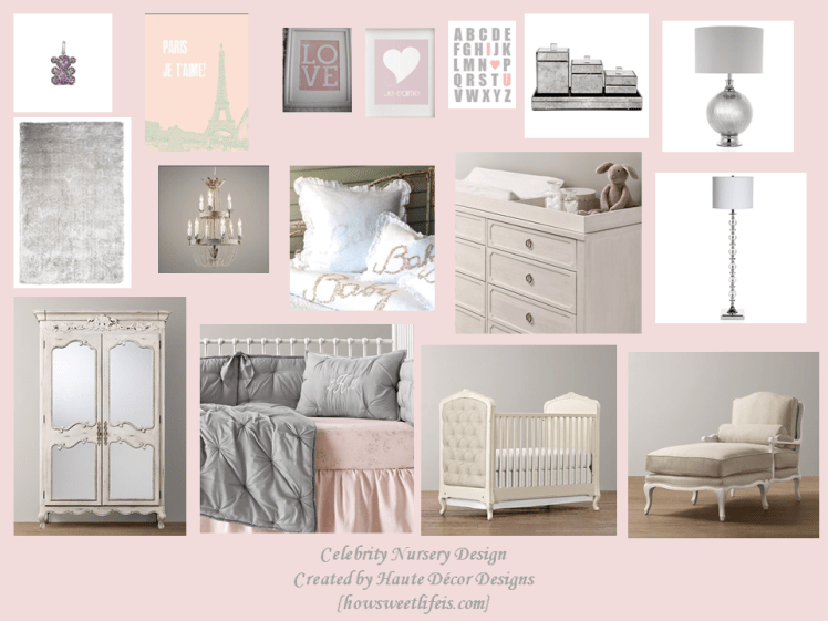 I created this chic nursery design, based on powder pink and rock star platinum, as a small tribute to the announcement of Shakira’s pregnancy today. I was *tickled pink* with the news and genuinely inspired to create an ultra feminine look for what I’m sure will be one very spoiled, and deeply loved, baby.