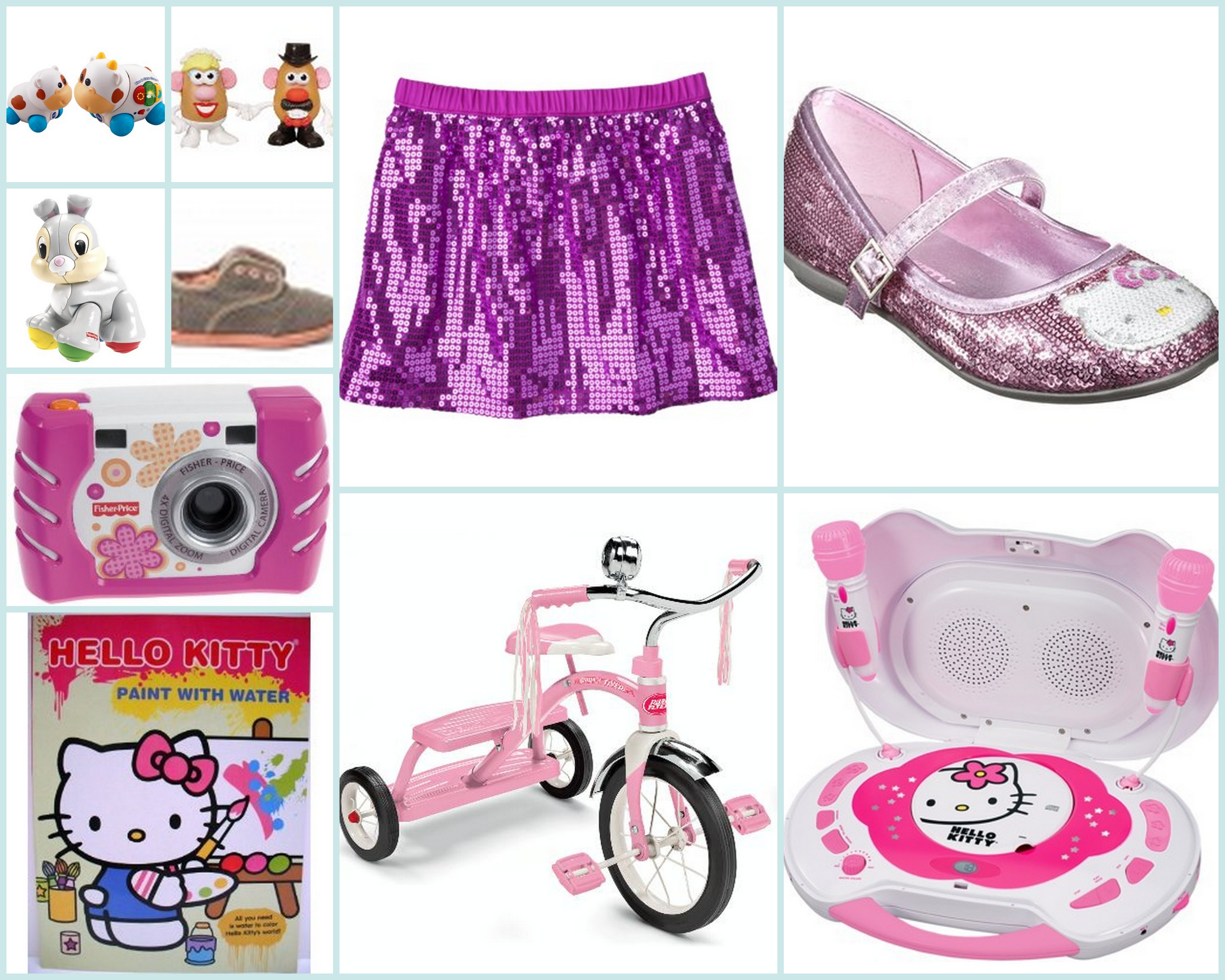V-Tech Kiss & Care Cows $10; Mr and Mrs Potato Head $14; Fisher Price Camera $32; Baby Thumper $10; Corduroy Toms Shoes for Boys $34; Hello Kitty Paint with Water $6; Cherokee Sequined Skirt (Target) $15; Pink Hello Kitty Mary Janes (Target) $20; Pink Radio Flyer $60; Hello Kitty Karaoke CD Player $39 (Target)