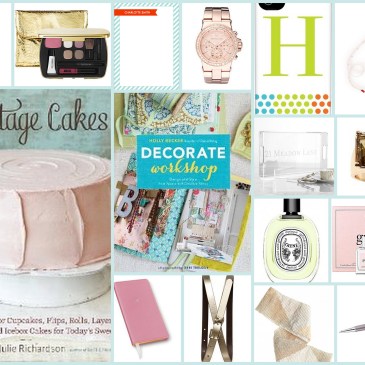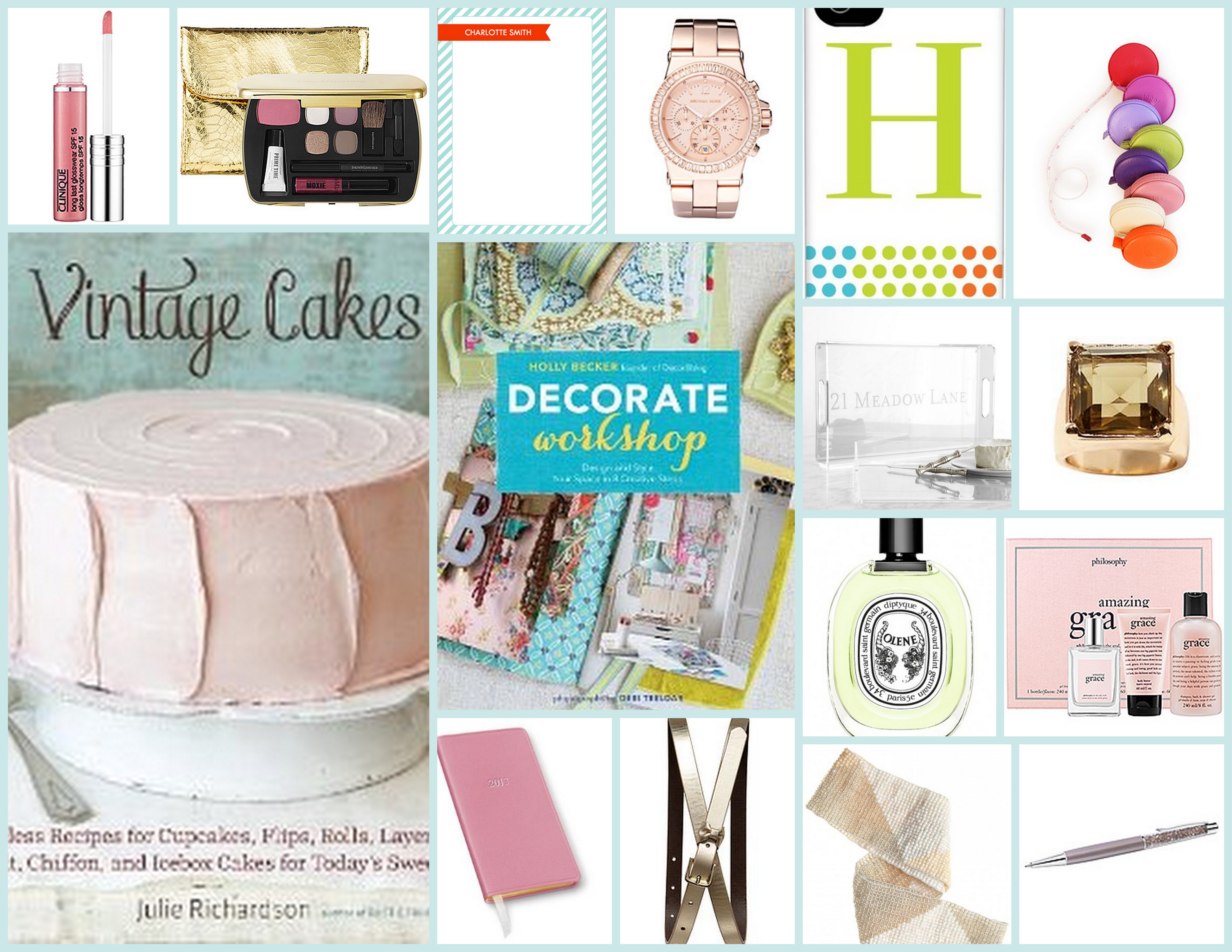 Clinique lip gloss ‘Air Kiss’ $15 at Sephora; Bare Minerals Makeup Palette with Gold Clutch $30 at Sephora; Personalized Stationery $15 at Shutterfly; Michael Kors Rose Gold Watch $295; Personalized iPhone Case $39 at Shutterfly; Mini Measuring Tapes $10 at Kate’s Paperie; Vintage Cakes book $15 and Decorate Workshop book $18 via Amazon; Personalized Acrylic Tray $55 via Mark and Graham; Gemstone Ring $39 at Banana Republic; Olene Fragrance by Diptyque Paris $88; Amazing Grace Gift Set by Philosophy $39.50 at Sephora; Pink Pocket Planner $15 via Amazon; Gold Bow Double-Belt $28 at Banana Republic; Beaded Geometric Belt $55 at Calypso St Barth; Swarovski Vintage Rose Pen $34.